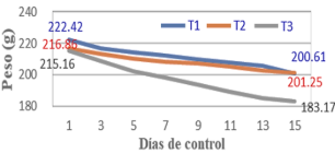 Figura 1. Tendencia de los pesos de las naranjas durante el almacenamiento. Peso promedio de 10 unidades de naranjas, pesados individualmente.