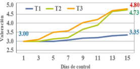 En la Figura 2 los datos recogidos de acuerdo a la tabla de color para naranja Valencia de 0 a 6. ICONTEC (2013) recomienda hacer la cosecha en el estadio 3, donde existe equilibrio entre los sólidos solubles y acidez de la fruta; la variabilidad del índice de color (IC), iniciando de 3,0 para todos los tratamientos, presenta una variación para T1 de 3,35; T2 de 4,67 y T3 de 4,80; Filoteo et al. (2023) indican que a 30 días de almacenamiento a 16 °C, el IC fue el equivalente a 4,0; Jiménez et al. (2024) de 3,0 a 3,5 a 6 °C en 4 semanas; Yajahuanca (2021) de 3,5 a 3,6; almacenado por 2 semanas, recubierto con bicarbonato de sodio a temperatura de 14 a18 °C. Velázquez (2014) menciona que el cambio ligero en el color de los frutos es por la disminución del metabolismo, ya que esta actividad es dependiente de las temperaturas de almacenamiento, a menor temperatura, menor actividad metabólica, por lo tanto, menos cambios bioquímicos, que coincide con Arilla et al. (2022), respecto al cambio de color por estas causas; Zacarias et al. (2022) y Rodrigo et al. (2019) afirman que los carotenoides específicos como el α-caroteno, el β-caroteno y la β-criptoxantina son los principales componentes del desarrollo del color de los cítricos.