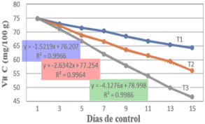 La mayor o menor vida útil del producto va a depender de la naturaleza del producto en sí, pero también de otros factores de manipulación (Murillo et al., 2022), los procesos de higiene y de conservación a los que se someta, condiciones de almacenamiento como temperatura, humedad, envasado, etc. Cabanillas & Aurora (2020) estable-cen que existe mayor sensibilidad de los parámetros cinéticos de degradación de vitamina C y color a mayor temperatura de exposición.