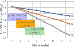 Orden de las reacciones. En las figuras 3 y 4 se muestra la determinación del orden de reacción de los tres tratamientos almacenados a diversos rangos de temperatura y se determinó el orden de reacción cinético de la vitamina C, para lo cual se utilizaron los datos obtenidos que se observan en los gráficos, de ello se considera lo más adecuado la cinética de orden 1 (n=1), puesto que los valores del coeficiente de determinación se encuentran cercanos a uno, por lo que se consideran un mejor ajuste lineal.