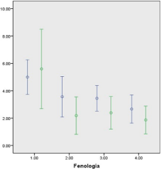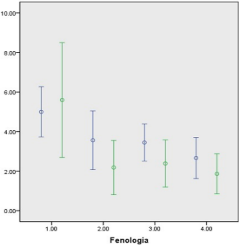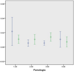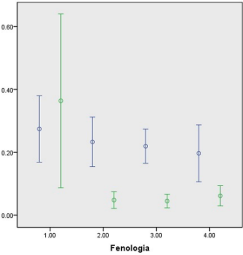 Figura 3. Taninos totales (%) en follaje fresco (azul) o seco (verde) de la Acacia polyphylla en los estados fenológicos 1: Crecimiento activo; 2: Prefloración; 3: Floración; 4: Fructificación.