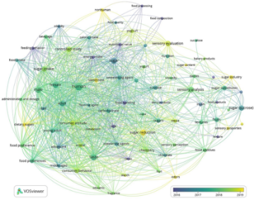 With 23 items displayed in green color, the second cluster shows the relationship between sugar consumption and consumer attitudes among different demographic groups including men, women, adolescents, and young adults. It was also found that taste and food consumption were related to obesity and sugar consumption. As shown in the third cluster of blue color with 15 items, sugar, controlled studies, and sweetening agents are the central themes. The fourth cluster with 8 items showed developments in flavors and aromas for dairy and starch products as well as consumer and animal sensory preferences and behaviors.