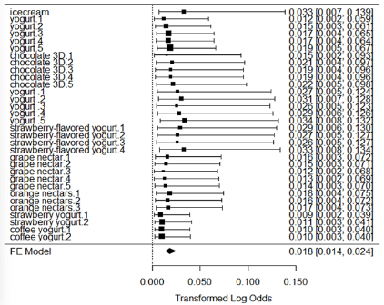 The heterogeneity of estimation was not significant (Q=7.8603, I2= 0.00%), indicating that sugar reduction and product acceptance are consistent across the studies without impacting the effect. In addition, the fixed model showed low values of Akaike Information Criterion (AIC) = 53.90, Bayesian Information Criterion (BIC)=55.36, and Corrected Akaike Information Criterion (AICc) =54.03, indicating a good model fit.
