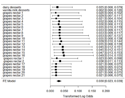 The heterogeneity of data was not significant (Q=6.1765, I2= 0.00%), allowing us to estimate the impact of sugar reduction on product acceptance consistently across the papers. This fixed model shows adequate values for some criteria of model goodness: AIC=39.19, BIC=40.40, and AICc=39.36.
