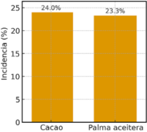 Figura 2. Incidencia de nidos de Nasutitermes spp. en cacao y palma aceitera.