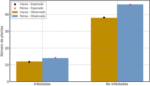 En cacao, de las 50 plantas inspeccionadas, 12 (24,0%) presentaron nidos visibles. En palma aceitera, de las 60 plantas revisadas, 14 (23,3%) estuvieron infestadas. En conjunto, se detectaron 26 plantas infestadas (23,6%) del total de la muestra (Tabla 1; Figura 2).