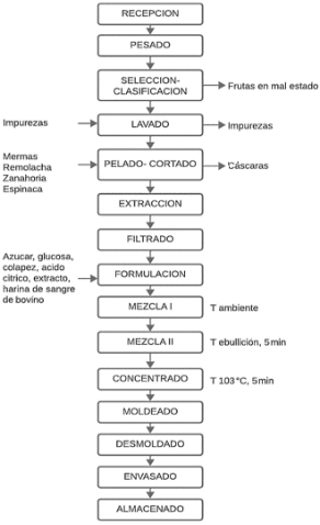 Para todos los casos, la preparación de las muestras incluyó la selección de insumos adecuados, proce-diendo con la extracción de 300 ml de extracto de zanahoria, remolacha o espinaca mediante la utiliza-ción de un extractor de 1 kW, modelo FPSTJE318R. Posteriormente, se preparó la muestra en dos partes: En primer lugar se preparó una mezcla I hidratando el colapez a temperatura ambiente con la adición de 250 ml del extracto correspondiente, y en segundo lugar, se preparó una mezcla II disolviendo el azúcar, el ácido cítrico y la cantidad de harina de sangre bovina correspondiente con 50 ml del extracto restante.