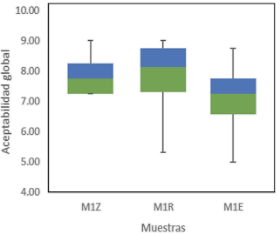 Los datos no paramétricos de aceptabilidad general se sometieron al análisis de Friedman y se presentaron gráficamente a través de diagramas de caja y bigotes. Por otro lado, los datos paramétricos se expresaron en términos de promedio ± desviación estándar y se sometieron a un análisis estadístico mediante el uso del software SPSS. Las diferencias entre los tratamientos se establecieron a través de un análisis de varianza de una vía (ANOVA) y se aplicó la prueba de Tukey para determinar la presencia de diferencias significativas entre los tratamientos. Los valores de p ≤ 0,05 se consideraron estadísticamente significativos.