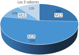 Además, se llevó a cabo una evaluación de las preferencias generales de consumo de las muestras analizadas. Los resultados revelaron que la mayoría de los participantes, un 52%, mostraron una preferencia por la muestra M1R, seguida de cerca por M1Z con un 26%. Un 11% de los encuestados manifestó su preferencia por la muestra M1E. Interesantemente, un porcentaje igual, un 11%, demostró una preferencia por los tres sabores de manera equitativa, lo que sugiere una diversidad en las preferencias de los consumidores (Figura 3).