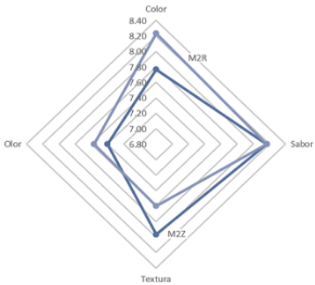 En los resultados de la prueba hedónica, se destaca una clara preferencia por el parámetro sabor, seguido por el color, la textura y el olor. En particular, la muestra M2R obtuvo una alta aceptación global con una puntuación de (7,89 ± 1,14), mientras que la muestra M2Z también logró una buena aceptación, con una puntuación de (7,83 ± 0,98).